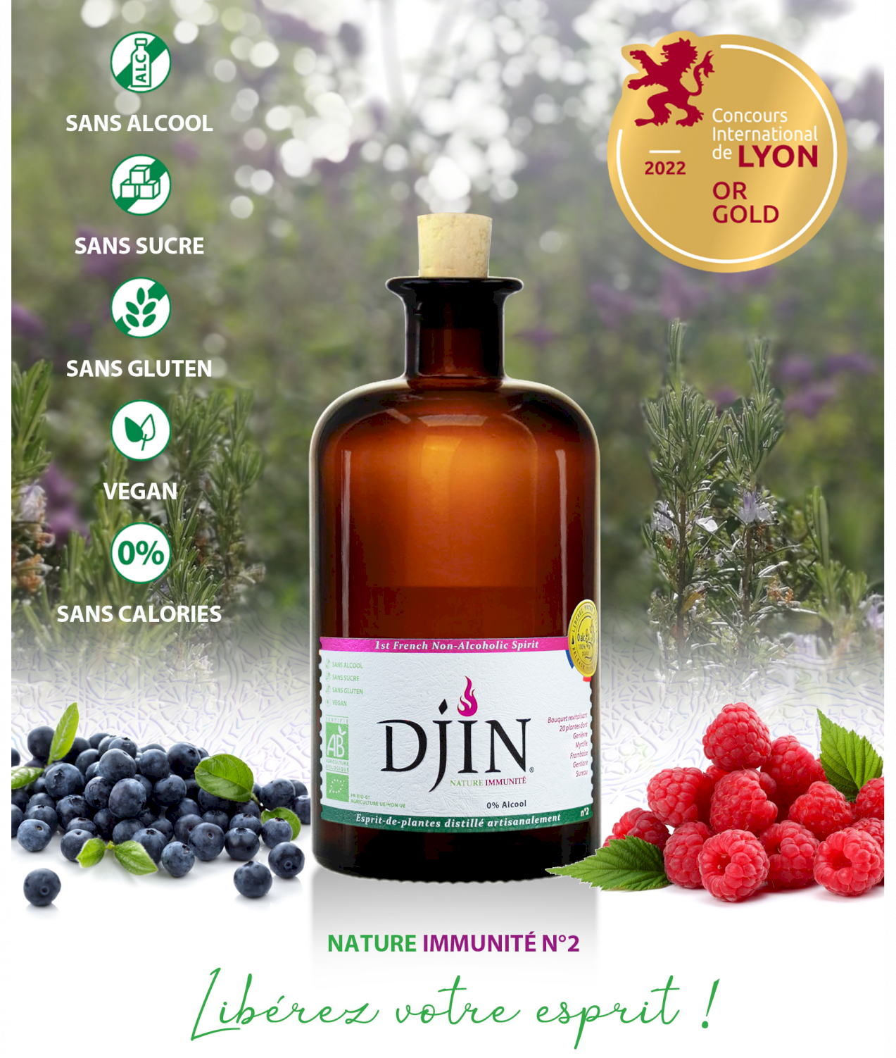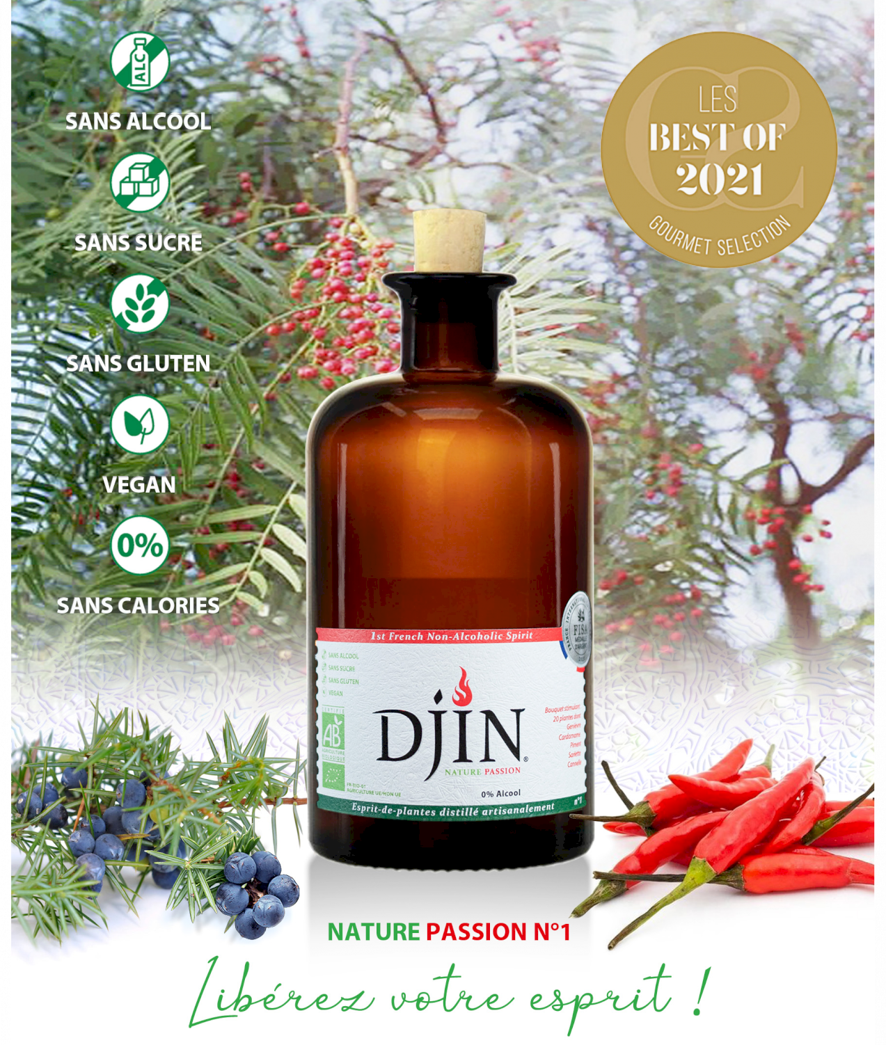 Premier "spiritueux sans alcool" français et "Gin sans alcool" le plus titré au monde, Nature Passion est un véritable esprit du feu: Il est ainsi élaboré a base de 20 plantes médicinales sélectionnées pour leurs vertus stimulantes et ... Lire la suite