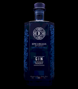 Inspirée des années 1920 et 1930, la bouteille d'Epicureans Spirit incarne l'élégance Art déco avec sa forme géométrique épurée et ses motifs gravés sur un verre bleu profond.