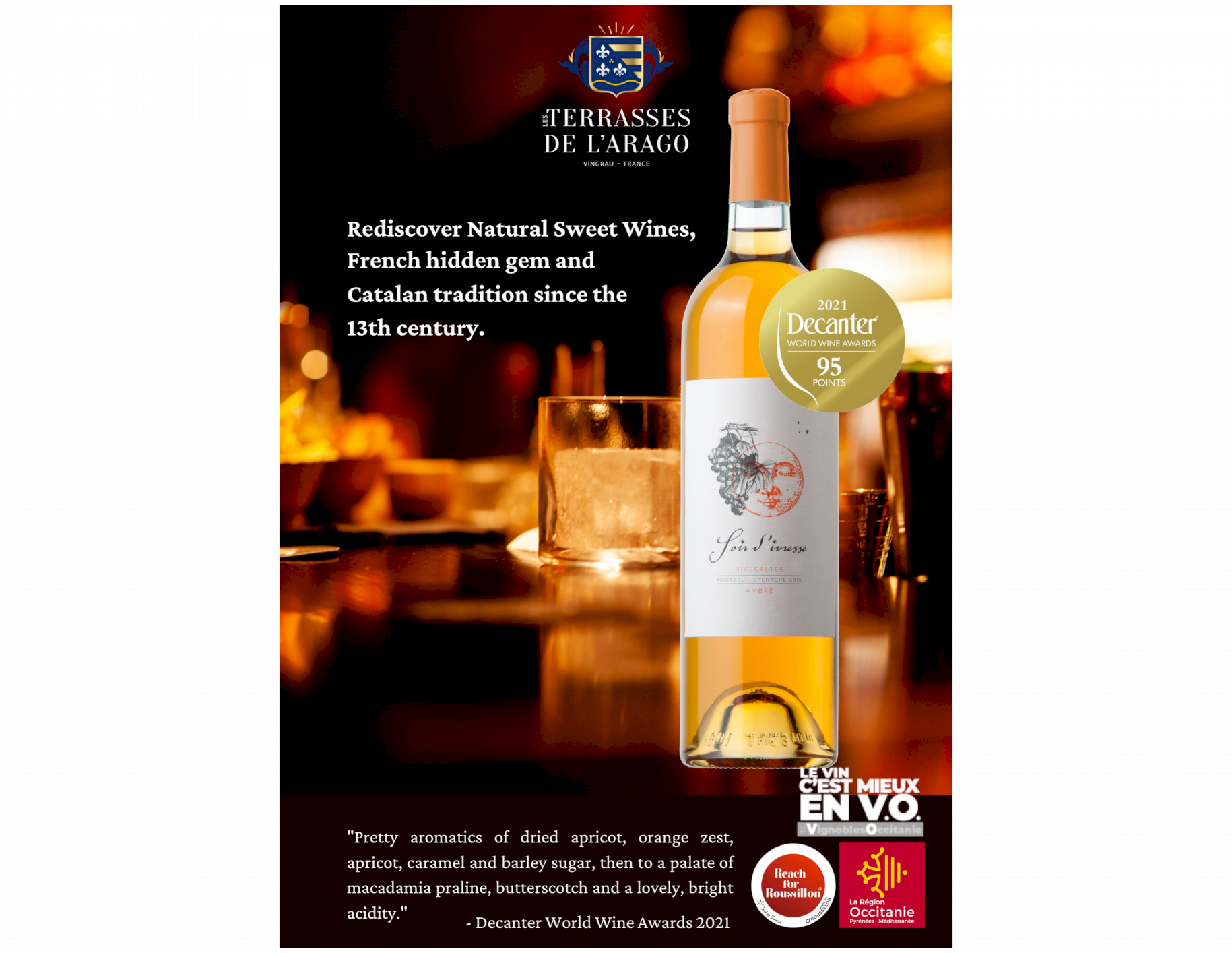 Rivesaltes Ambré, vin doux naturel, tradition du Roussillon par excellence. Soir d'ivresse, sous son slogan 'La Grandeur des Petits' propose des produits qualitatifs, atypiques, peu représentés, mais avec un fort potentiel : des vins qui sont de la poésie en bouteilles.