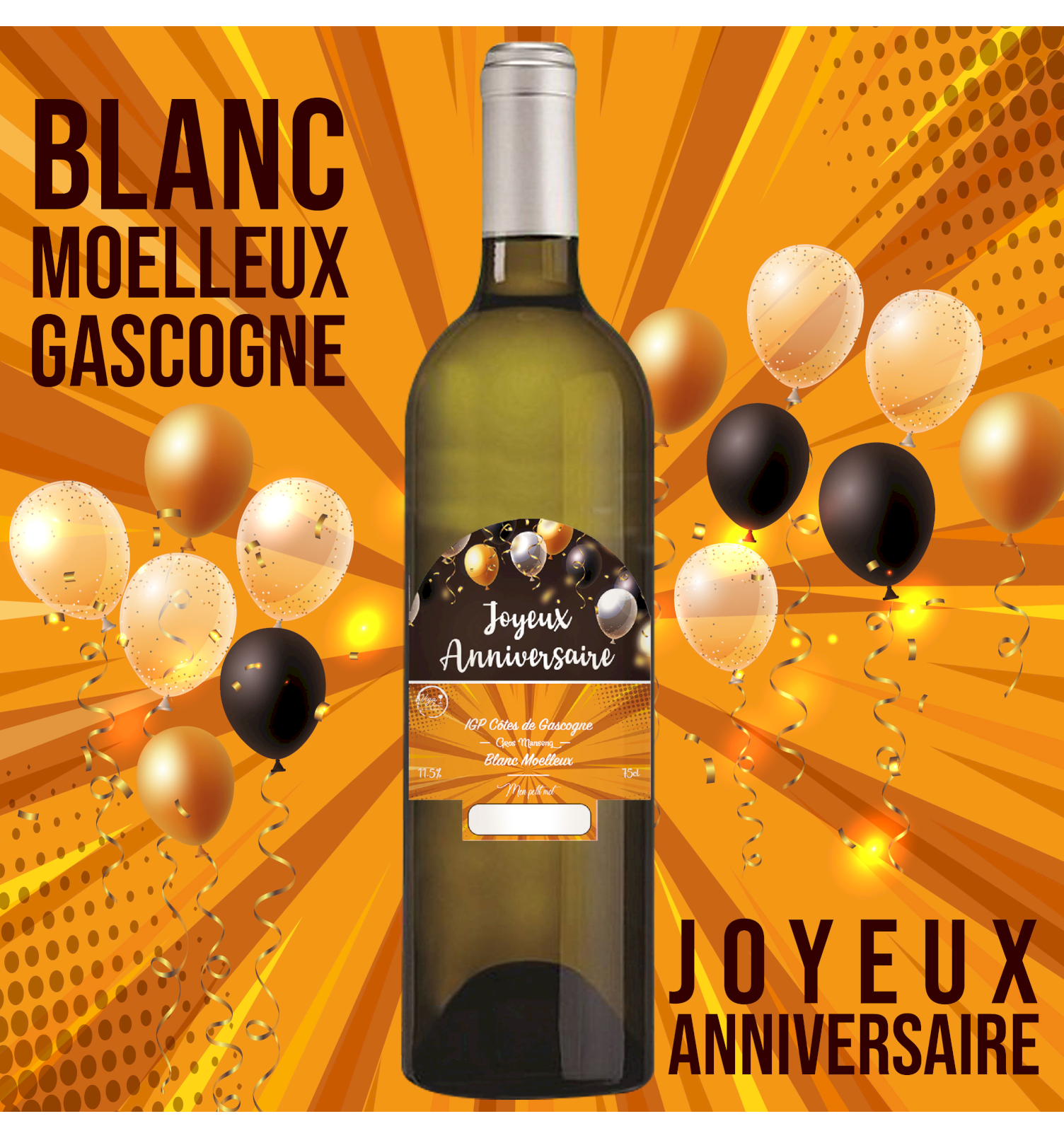 Une bouteille originale pour souhaiter un joyeux anniversaire ! Un vin unique renfermant un produit de qualité. Ce Côtes de Gascogne 100% gros Manseng saura séduire votre palais avec ses notes d'agrumes, de fruits secs et de fruits confits. ... Lire la suite