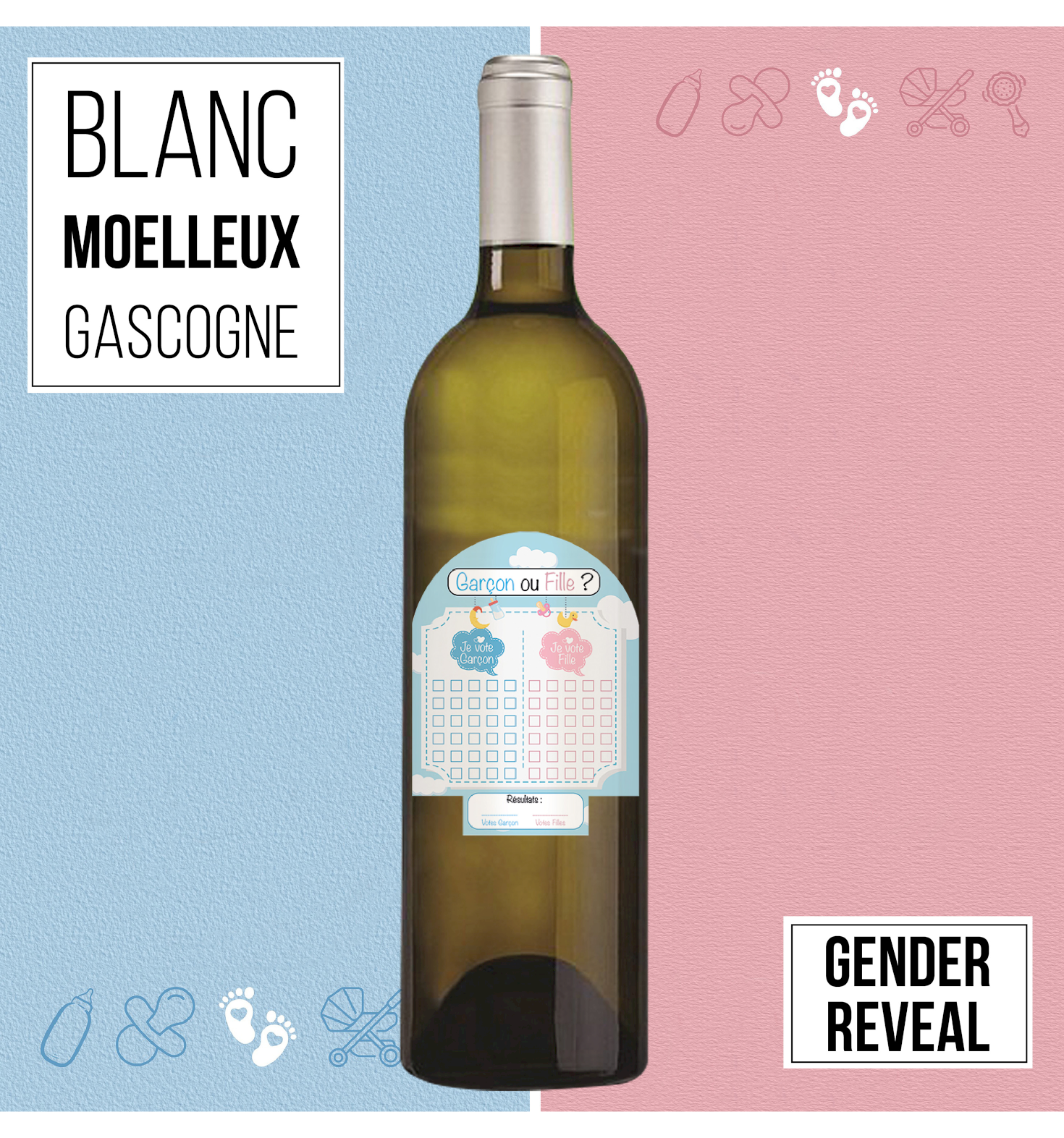 Une bouteille originale pour une Gender Reveal ! Mettez la à disposition de vos invités, afin qu'ils puissent cocher s'ils votent pour un garçon ou pour une fille.Un vin unique renfermant un produit de qualité. Ce Côtes de Gascogne 100% gros ... Lire la suite