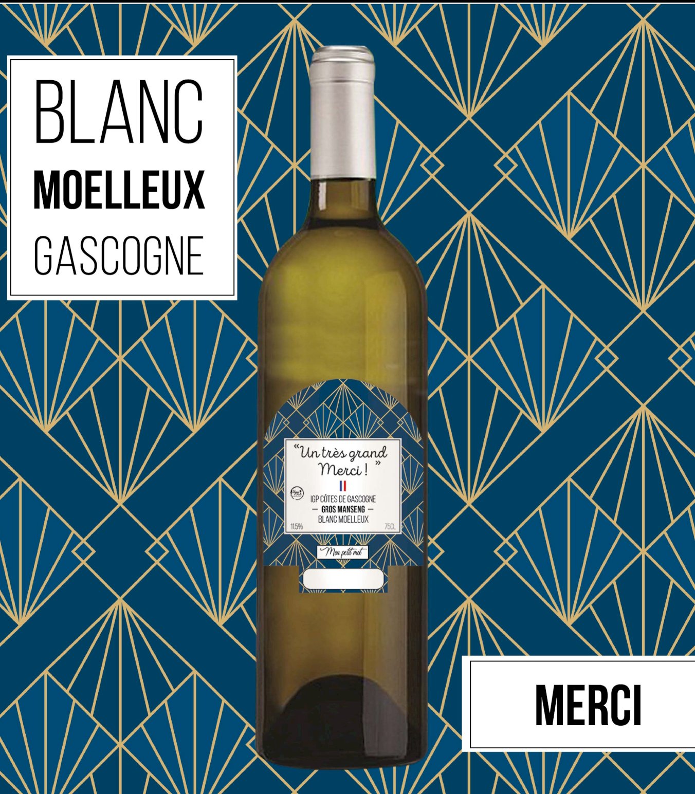 Une bouteille originale pour remercier ! Un vin unique renfermant un produit de qualité. Ce Côtes de Gascogne 100% gros Manseng saura séduire votre palais avec ses notes d'agrumes, de fruits secs et de fruits confits. Idéale à l'apéritif ou en ... Lire la suite