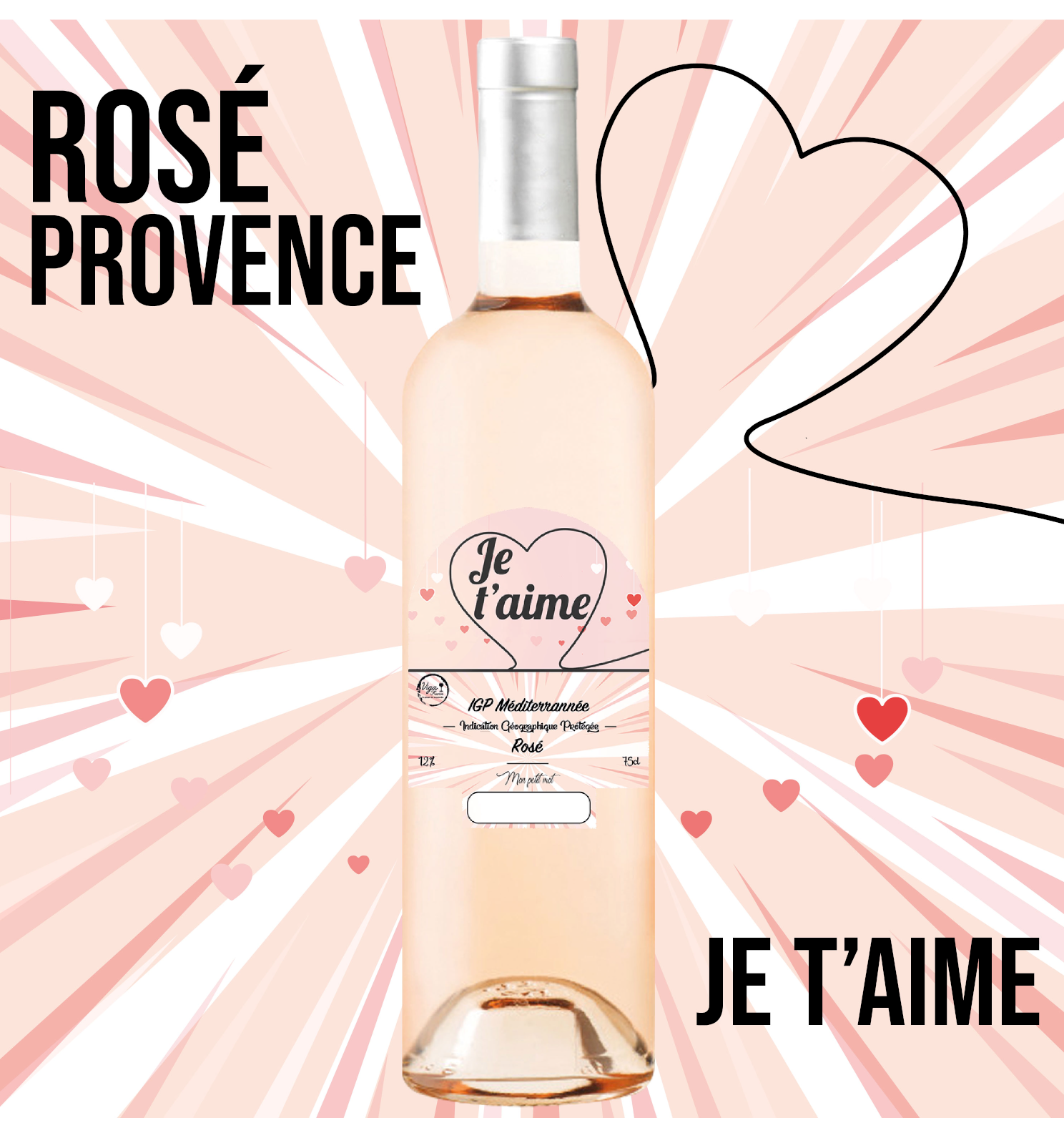Une bouteille originale pour dire "je t'aime" ! Un vin unique renfermant un produit de qualité. Ce réseau de Provence est fruité et léger. À servir frais pendant des repas entre amis, des grillades et des grandes salades.